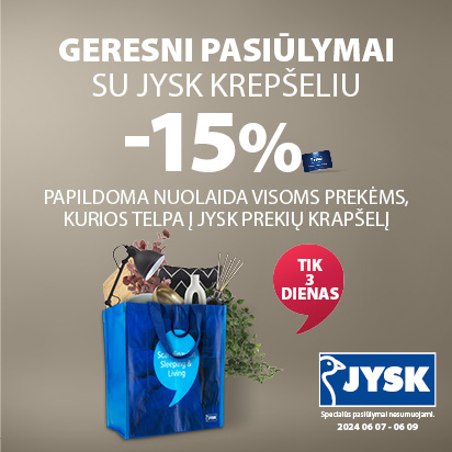 ‘-15% papildoma nuolaida visoms prekėms, kurios telpa Į JYSK prekių krapšelį