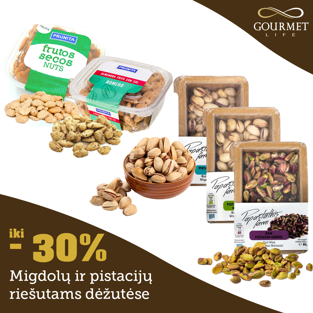 Gourmet life parduotuvėje, kurią rasite prieš RIMI kasas taikoma iki -30% nuolaida migdolų ir pistacijų riešutams dėžutėse.