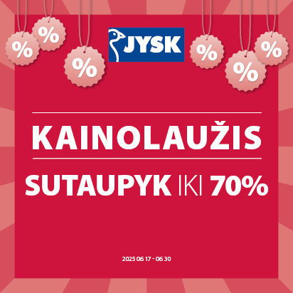 KAINOLAUŽIS jau prasidėjo JYSK parduotuvėse! Sutaupykite iki 70% vidaus ir lauko baldams, pagalvėms, patalynėms, užuolaidoms ir čiužiniams.
