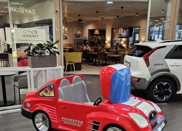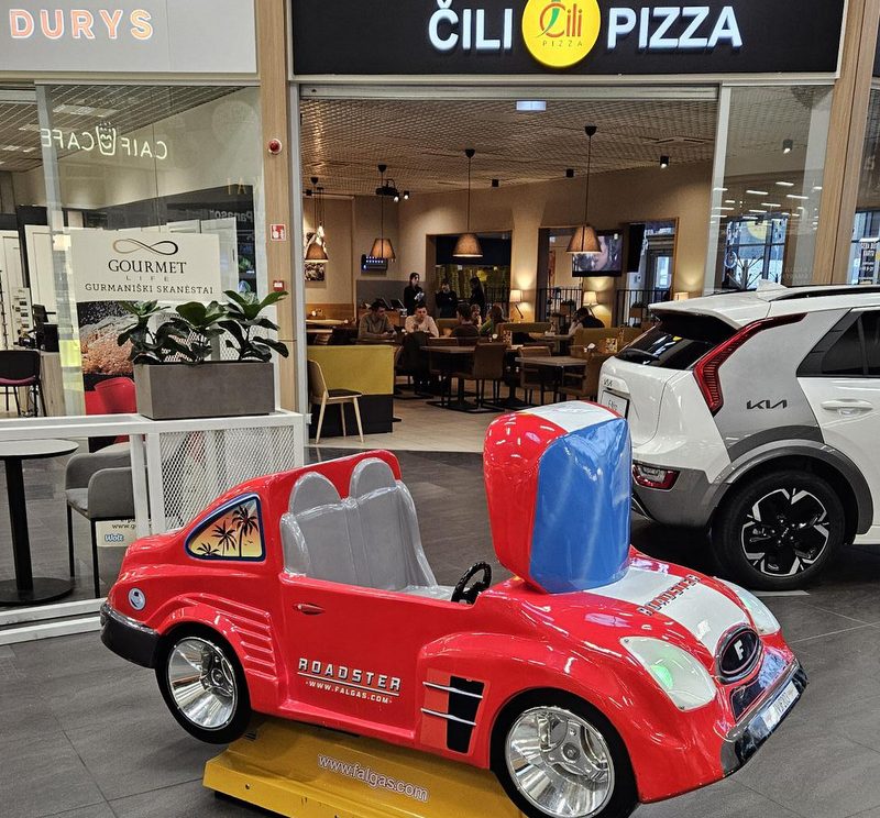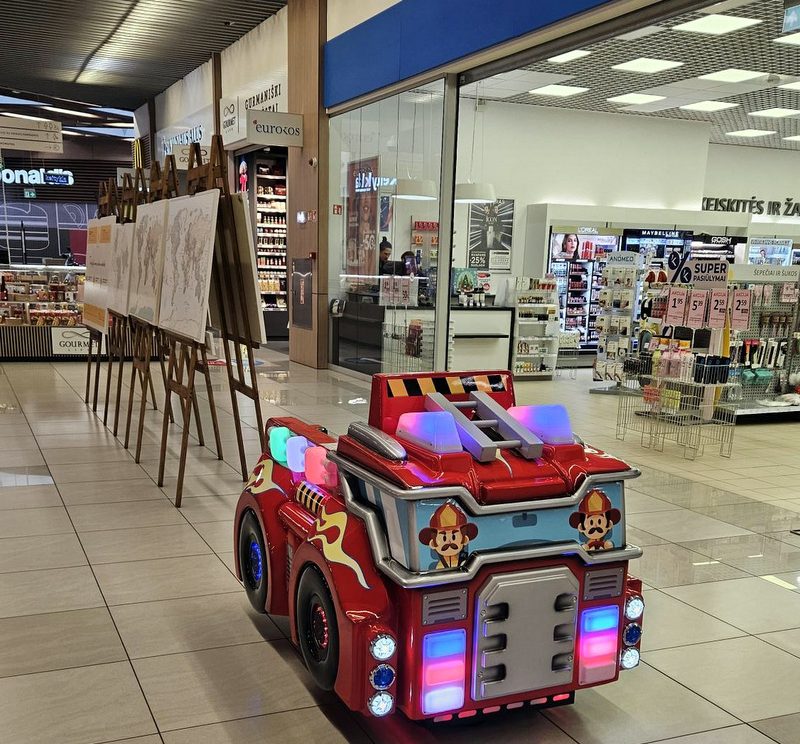 Children’s play cars you will find in fromt of RIMI and near SENUKAI/ČILI PICA.