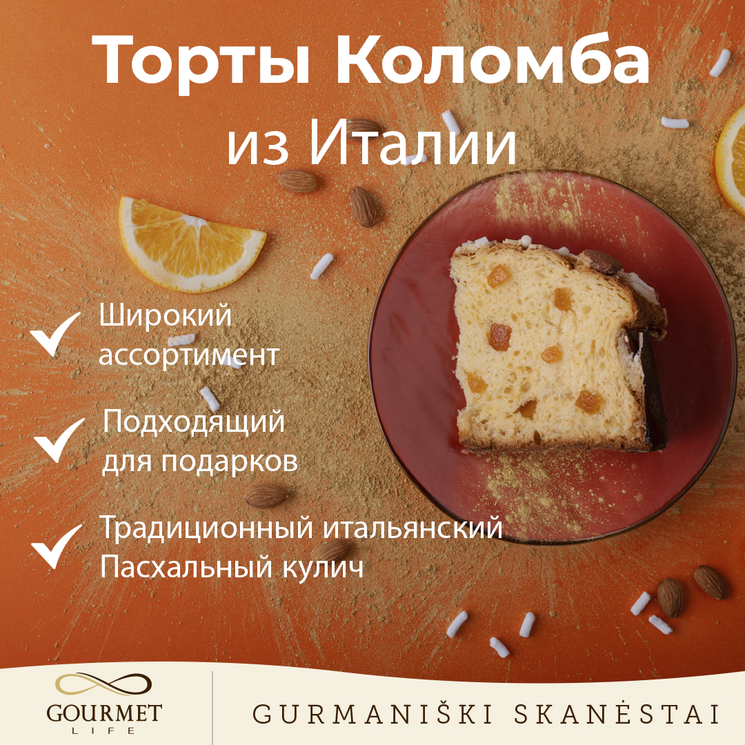Коломба — итальянский пасхальный кулич. Рецепт этого торта очень похож на итальянский рождественский торт – панеттоне. Этот торт приготовлен из муки, яиц, сахара, натуральных дрожжей и сливочного масла. Торт «Коломба» Классико смешан с цитрусовыми — засахаренными цедрами лимона или апельсина, которые придают торту свежесть и могут напомнить о приближающейся весне. Снаружи он покрыт хрустящей корочкой с сахарным жемчугом и миндалем. Сливочное масло — это ингредиент, который придает торту идеальную текстуру и мягкость, благодаря чему он тает во рту и имеет потрясающий вкус.