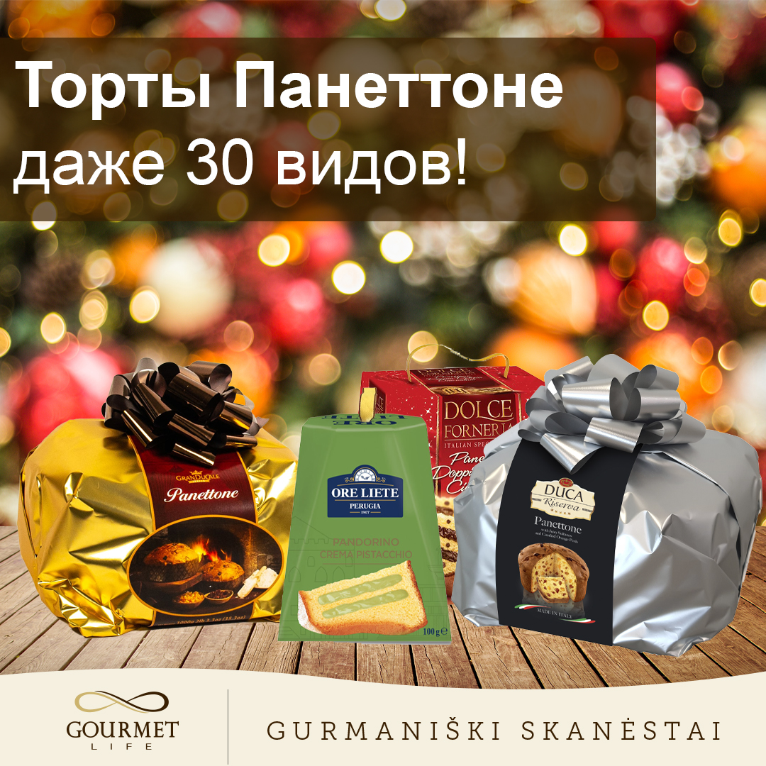 В магазине «Гурманская жизнь» в этом году вы найдете более 30 различных видов тортов Панеттоне! Пирог Панеттоне – традиционный итальянский рождественский десерт, но он уже стал традицией и в Литве! Это не только необходимый атрибут новогоднего стола, но и отличный подарок близкому человеку, другу, коллеге или руководителю!