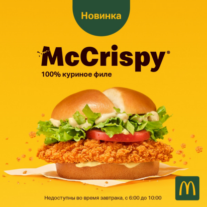 Загляните в ”McDonald’s” и влюбитесь в новый бургер “McCrispy”. Очень сочное, 100% куриное филе, приготовленное на специально подобранной сковороде для хруста. На аппетитной булочке со свежими листьями салата, ломтиком помидора и медово-горчичным соусом.